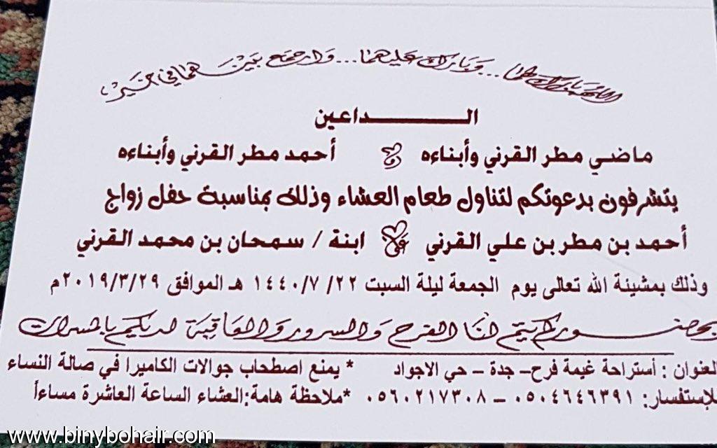 دعوة ..."عويضة بن احمد القرني" يدعوكم لحضور زواج ابنه " محسن "1439/4/4 بالقاعة الذهبية بجدة | علي بن قحمان القرني | أفراح وتهاني بني بحير بلقرن | 2 | 12-06-2017 05:08 AM |