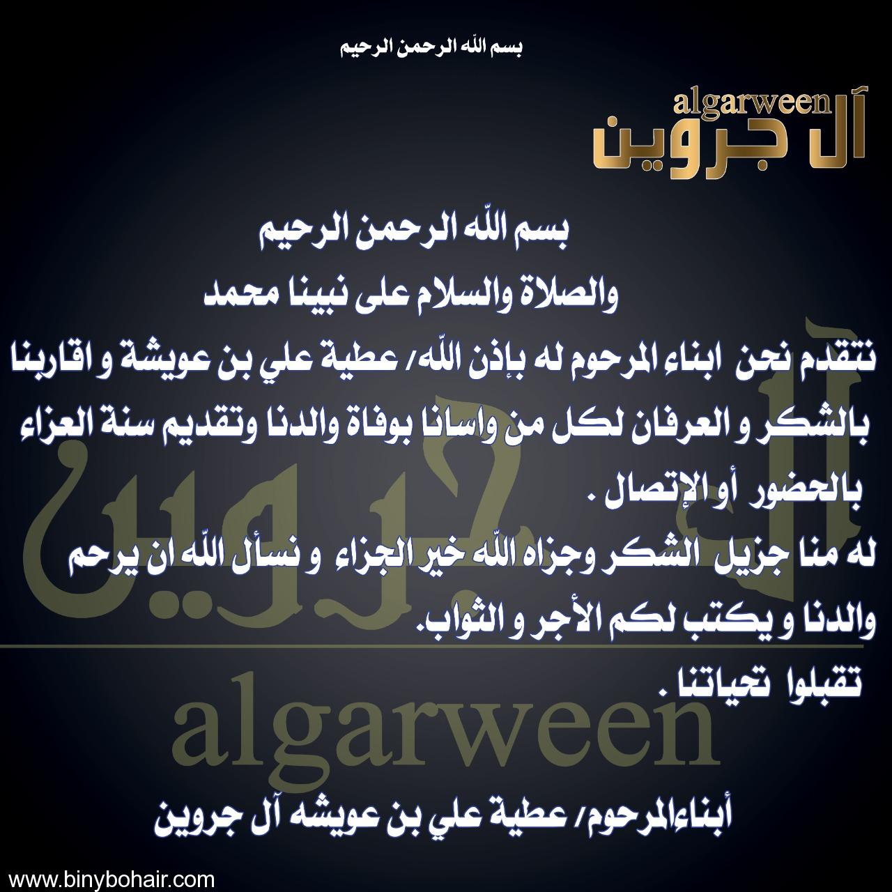 " عبدالله احمد الوهاسي القرني" وبالنيابة عن الأسرة..يوجة رسالة شكر وتقدير لكل من واسهم في أخية ووالدهم " محمد" سملان" | علي بن قحمان القرني | المركز الاخباري و الاعلامي لبني بحير بلقرن | 1 | 06-04-2018 09:23 AM |