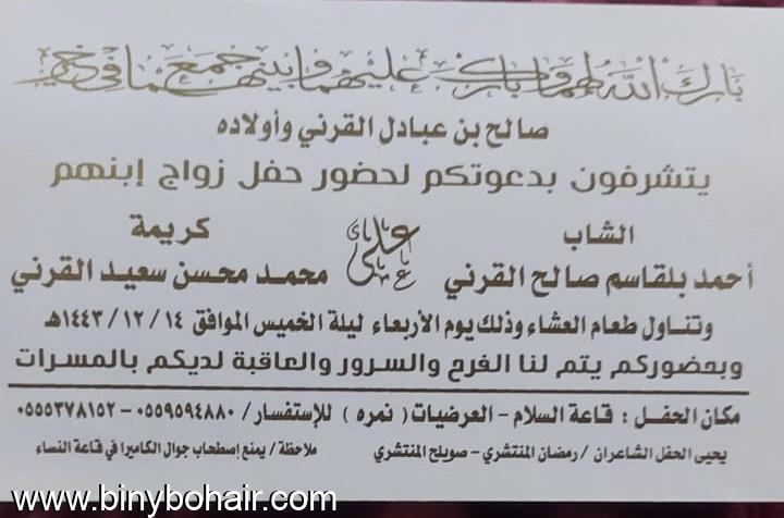 " حسن بن علي القرني & علي بن سفيّر القرني " يتشرفون بدعوتكم لحضور زواج ابنهم " احمد" بمدينة الرياض | علي بن قحمان القرني | أفراح وتهاني بني بحير بلقرن | 1 | 08-07-2018 08:59 AM |