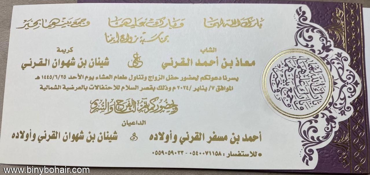 دعوة …" احمد سعد آل مريّع " يتشرف بدعوتكم لحضور زواج ابنه " علي "في قاعة الجوهرة بنمرة 1445/5/3 | علي بن قحمان القرني | أفراح وتهاني بني بحير بلقرن | 1 | 11-18-2023 11:18 AM |