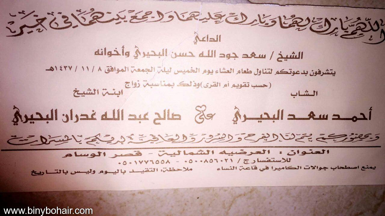 دعوة عامة من شيخ بني بحير / حربان بن موسى لحضور زواج ابنه | علي بن قحمان القرني | أفراح وتهاني بني بحير بلقرن | 2 | 07-24-2016 06:41 AM |