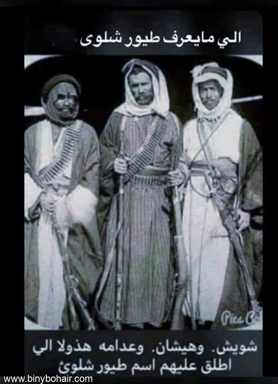 http://[/IMG]طيور شلوى وهم ثلاثة أطفال كبيرهم عمره ثلاث سنوات والاصغر تحت السنتين توفي والدهم ( عجرش ) وبعده بستة أشهر توفيت والدتهم فلم يبقى لهم إلا جدتهم من ابيهم وتدعى شـلوى ونظرا لضيق ذات اليد اصبحت هذه العجوز تدور وسط البيوت تطلب أكل للاطفال ... فصارت ومن باب الاستلطاف تقول ماعندكم عشى او غدا لطويراتي تقصد بذلك الاطفال الثلاثة .. شاع خبرها بين الناس وعلم الشيخ عبد الكريم الجربا الملقب بـ( ابو خوذه او السمن العربي ) لكرمه علم بقصة هذه العجوز وأحفادها الثلاثه فأمر ان ينقل بيتها الى جوار بيته ومنذ ان انتقلت تلك العائلة الفقيرة إلى جوار الشيخ عبد الكريم أصبح يتفقد احوالهم وكأنهم أهل ُ له ومن ذلك انه قبل ان يقدم الغداء او العشاء لضيوفه كان يقول لاتنسون طيور شلوى وكان يشرف هو بنفسه على ذلك .. ومع الايام كبر الاطفال الثلاثة وهم شويش وعدامه وهيشان .. واصبحوا رجالا يستطيعون القتال ونظرا لارتباط الحلال بالربيع رحل الجربا وجماعته الى مكان بالقرب من الحدود السورية حيث مكان الربيع والماء وهنا كان تواجد للدولة العثمانية الاتراك .. وايضا قبيلة اخرى ( تقطن هذا المكان) وكان الجربا وجماعته قليلي العدد مقارنة بكثافة تواجد الاتراك وايضا عدد افراد تلك القبيلة هنا طمعت تلك القبيلة وايضا الوالي التركي بقبيلة شـمر بقيادة الجربا .. فارسل الاتراك مرسال الى الجربا يطلبون ودي ( مثل الضريبة الان) .. اجتمع الجربا وافراد قبيلة شمر للتشاور ... ونظرا لقلتهم ايضا وجودهم المؤقت وافق الجربا على دفع الودي .. وبعد مدة بسيطة طُلب من الجربا ان يكون الودي مطبوق ( مضاعف) وهنا ايضا وافق الجربا وبعد مدة اي حوالي اسبوعين اقبل فرسان الاتراك ومن الجهة الاخرى فرسان القبيلة الموالية للاتراك وهنا ارسل الاتراك مرسال للجربا وطلب من الجربا ان يعطونهم خاكور .. باللهجة التركية لم يعرفوا معنى خاكور وقال ماذا تقصدون بالخاكور ؟؟؟ قال المرسال (( اي نساء من حريم شمر لجيش الاتراك لغرض المتعة)) هنا تدخل شايب من شيبان شمر ... وانشد قائلاً .. وكان في مكان بعيد عنهم قبور يستطيع الجميع من رؤيتها وهم في مجلس الجربا .. انشــد قائلا : هنيكم ياساكنين تحت قاع .. مامركم وديٍ تقفاه خاكور هنيكم مُـتم بحشمة وبزاع .. ومامن عـديم ينغـز الثـور وما ان قال ...مامن عديم ينغز الثور ؟... الا نكز شـــويش العجرش .. وقال انا . . وانا طير شلوى . وامتطى صهوة جواده واندفع منفرداً بشجاعة منقطعة النظير على جيش الاتراك حيث شق طريقا وسط جموع الخيل ... والطرابيش الحمر تتطاير يمنة ويسرة من ضرب شويش لرؤوس الخيالة هنا لحق به اخواه عدامة وهيشان العجرش الجربا ومن معه اغاروا على القبيلة الاخرى .. وماهي الا ضحوية كان كل شي قد انتهى .. لقد تم الانتصار على الاتراك وتلك القبيلة وغنم شجعان شمر والجربا مغانم ومن هنا اطلقت تسمية (طير شلوى) |