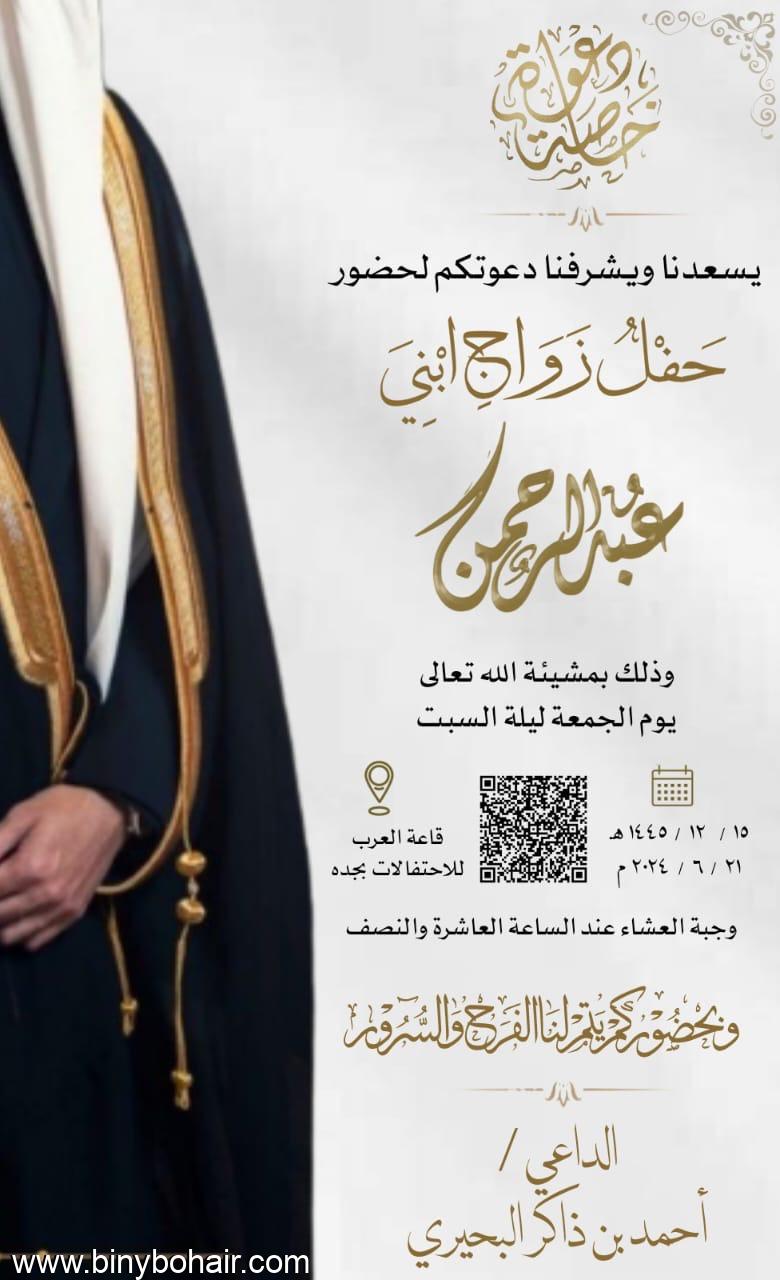 دعوة …" احمد سعد آل مريّع " يتشرف بدعوتكم لحضور زواج ابنه " علي "في قاعة الجوهرة بنمرة 1445/5/3 | علي بن قحمان القرني | أفراح وتهاني بني بحير بلقرن | 1 | 11-18-2023 11:18 AM |