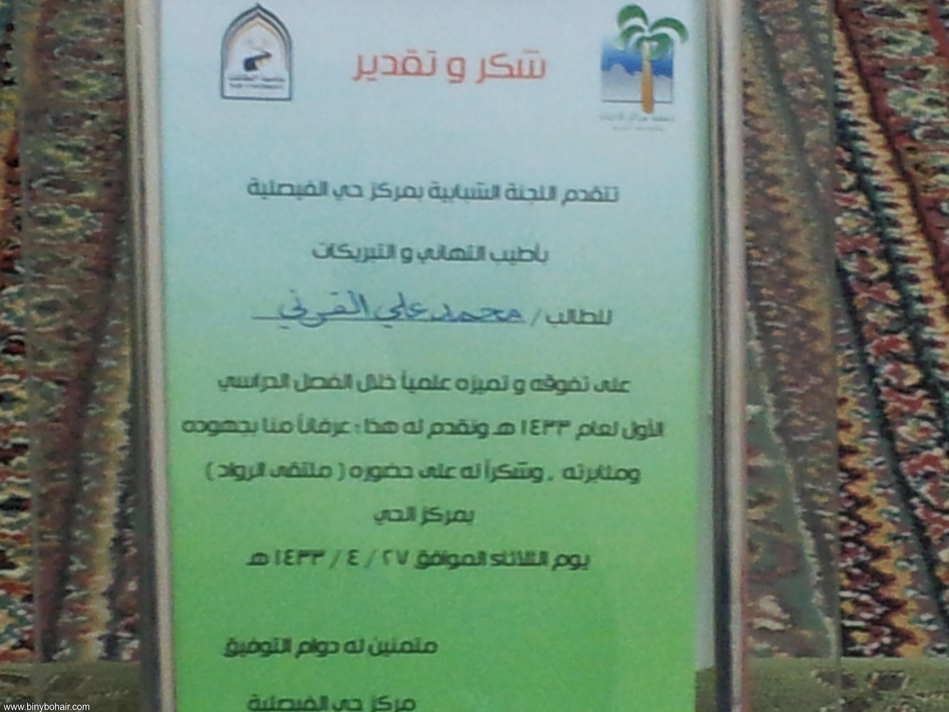 ![]() تبارك الله ما شاء الله ولا قوة الا بالله بحمد الله وتوفيقه تم ليلة البارحة الثلاثاء 27/04/1433هـ ببرنامج الرواد بمركز الموهوبين بالفيصلية بالطائف تكريم الابن محمد علي احمد البحيري القرني لتفوقه العلمي في الفصل الدراسي الأول لهذا العام 1433هـ وحصل كذلك على جائزة مسابقة المركز ورحلة الى المدينة المنورة وفيما يلي صور الحفل: ![]() جلوس بانتظار التكريم |