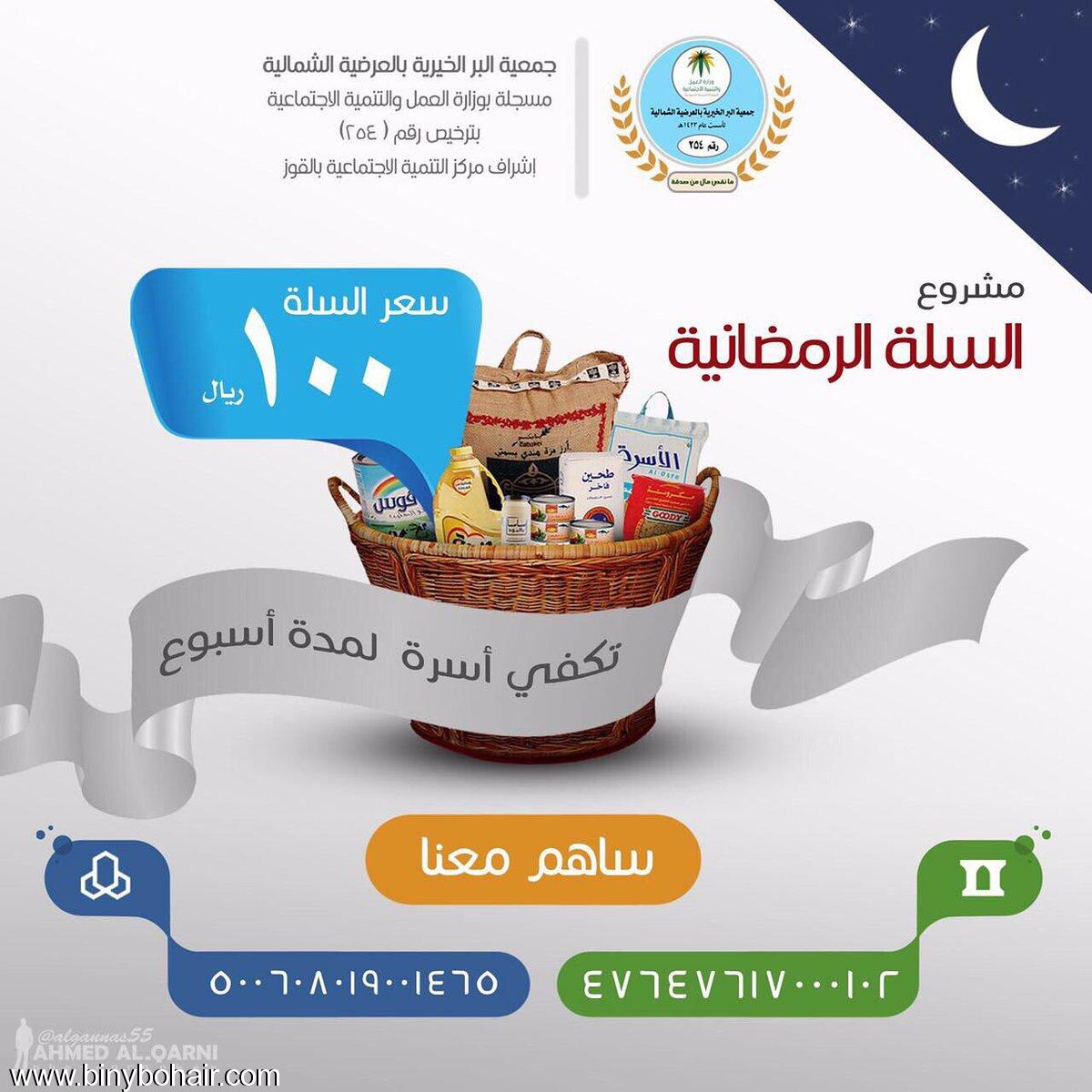 ![]() ![]() تعلن جمعية البر الخيرية بالعرضية الشمالية عن تقديمها لفرصة عظيمة لأهل العرضيات (مشروع السلة الرمضانية ) لتفطير الصائمين ولنا مثل أجورهم وبمئة ريال فقط و رمضان_كريم لاتتردد في المساهمة وفعل الخير |