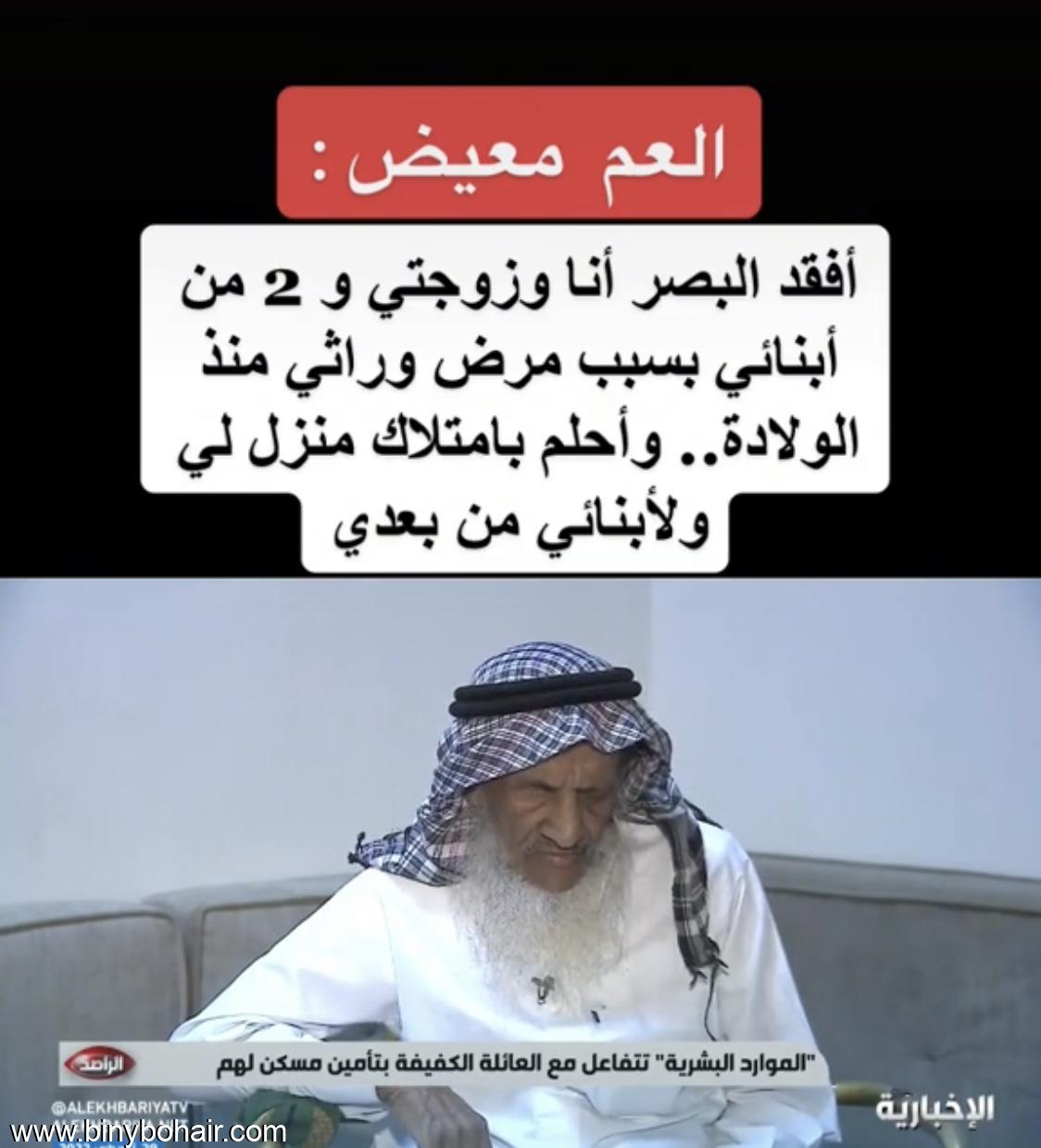 ![]() ![]() " معيض احمد البحيري" فقيد البصر هو وزوجته واثنين من ابناءه بسب مرض وراثي منذ الولادة ويحلم بامتلاك منزله له ولعائلته في مدينة جده هذه الحاله ظهرت في التلفزيون السعودي في القناة الاخبارية لأهل الخير .. نسأل الله ان يمن عليه بالعافية وعائلته وان يحقق لهم مايرجون.. |