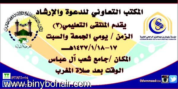 مكتب الدعوة بنمرة ينظم "الملتقى الشبابي الرابع لعام1437" | علي بن قحمان القرني | مكتب الدعوة بنمرة | 1 | 11-05-2015 08:01 AM |