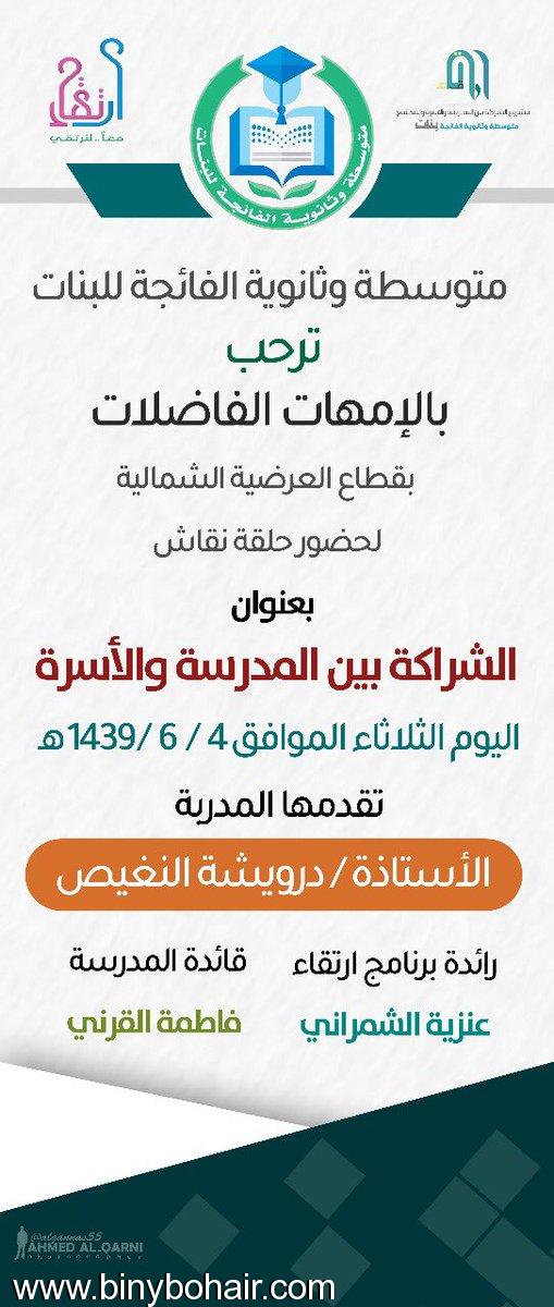 ![]() دعوة لحضور حلقة نقاش في برنامج ارتقاء .. يوم الثلاثاء الرابع من جماد الاخر والذي يستهدف امهات الطالبات ... بمتوسطه وثانوية الفائجه للبنات ![]() |
