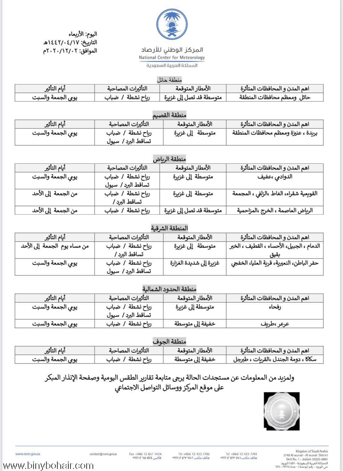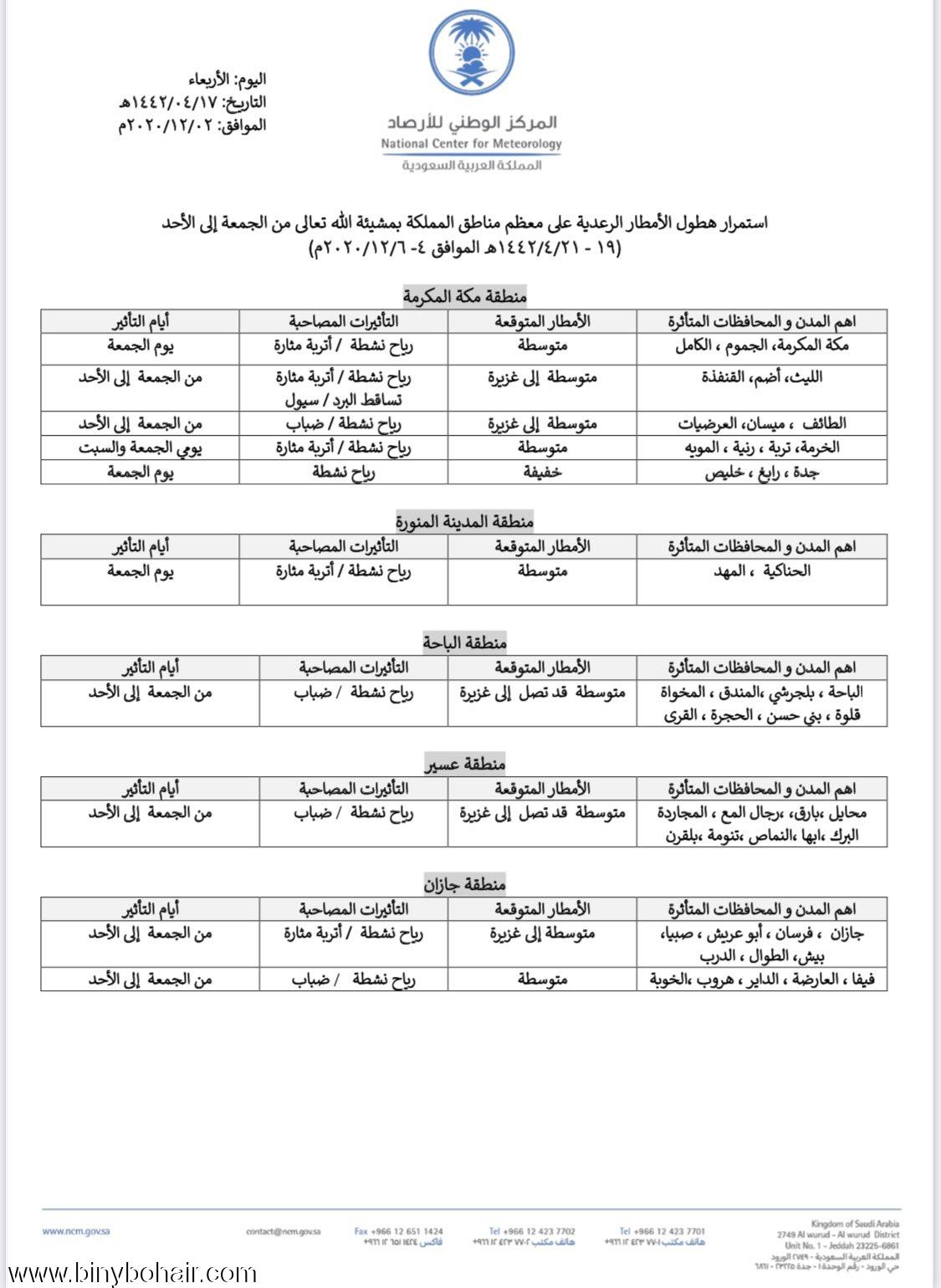 تقرير الارصاد عن الحالة الجوية التي تبدأ من الاربعاء على معظم مناطق المملكة | علي بن قحمان القرني | بني بحير للارصاد الجوية | 0 | 11-24-2020 06:14 PM |