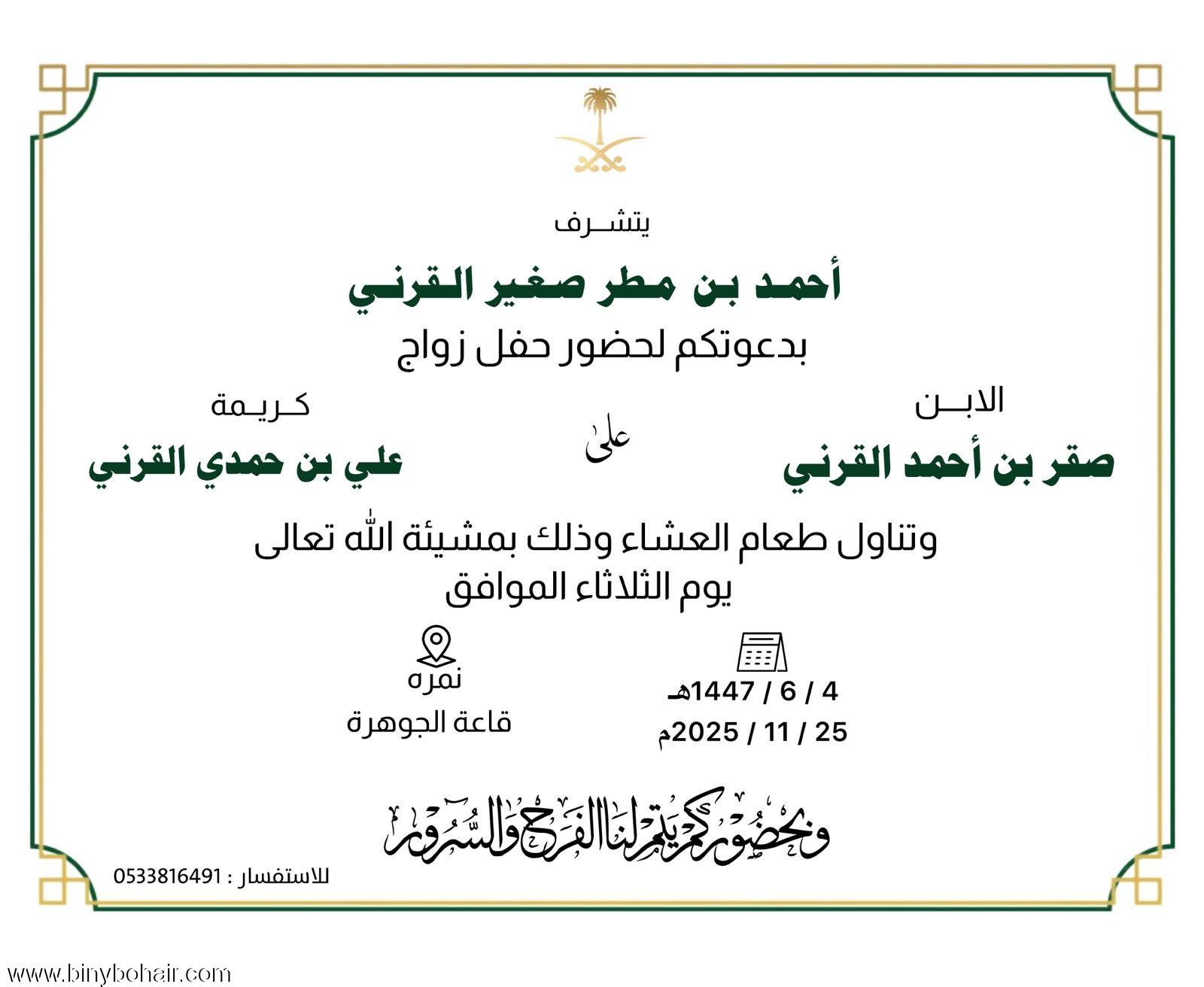 دعوة…" بركات عثوان القرني " يتشرف بدعوتكم لحضور زواج ابنه "علي " في 1447/7/25 بقاعة الوسام بنمرة | علي بن قحمان القرني | أفراح وتهاني بني بحير بلقرن | 1 | 10-20-2025 08:51 AM |