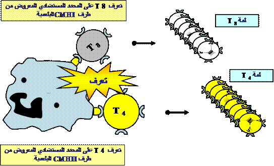 ـ إذا كانت البيبتيدات المعروضة منحدرة من بروتينات غير عادية للخلية(بروتين شاذ لخلية سرطانية أو بروتين فيروسي) فانه يحدث ارتباط بين الخلية و الخلايا المناعتية و بالتالي حدوث الاستجابة المناعتية.