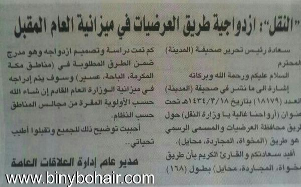![]() علي العاصمي_______ بني بحير تجاوباً مع مقال الاستاذ محسن السهيمي.. وزارة النقل تؤكد:أزدواجية طريق العرضيات في ميزانية العام القادم الطريق بطول 168 من المخواة الى محايل وسيدرج في ميزانية العام القادم 1435ـ ![]() |