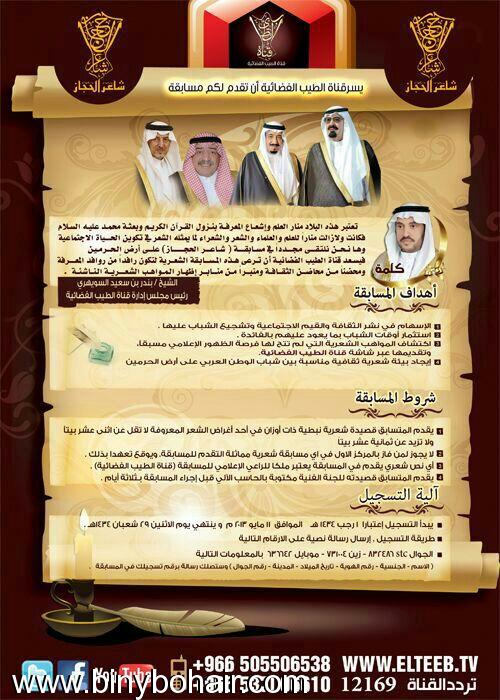 ![]() ستنطلق مسابقه شاعر الحجاز عبر قناة الطيب الفضائية وهي مسابقة وطنية تحمل روح الوﻻء للدين ثم المليك والوطن ولمن يرغب التسجيل فعلية اتباع الخطوات الموضحه في الصورة وأرتقبوا ذلك عبر قناتكم التي منكم ولكم ![]() |