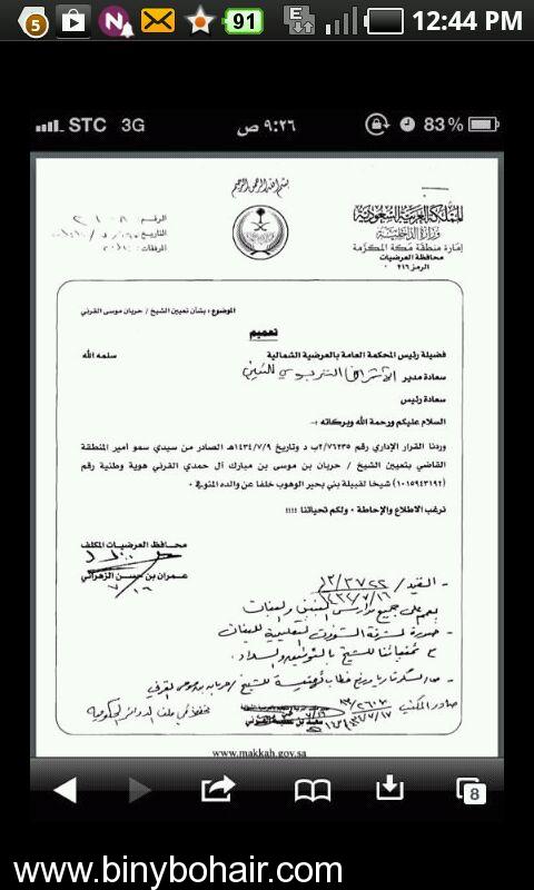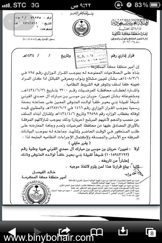 ![]() ![]() اليوم الاثنين الموافق 1434/7/17هـ تم اصدار قرار تعيين الشيخ حربان بن موسى مبارك القرني شيخاً رسمياً لبني بحير الوهوب ![]() ![]() |