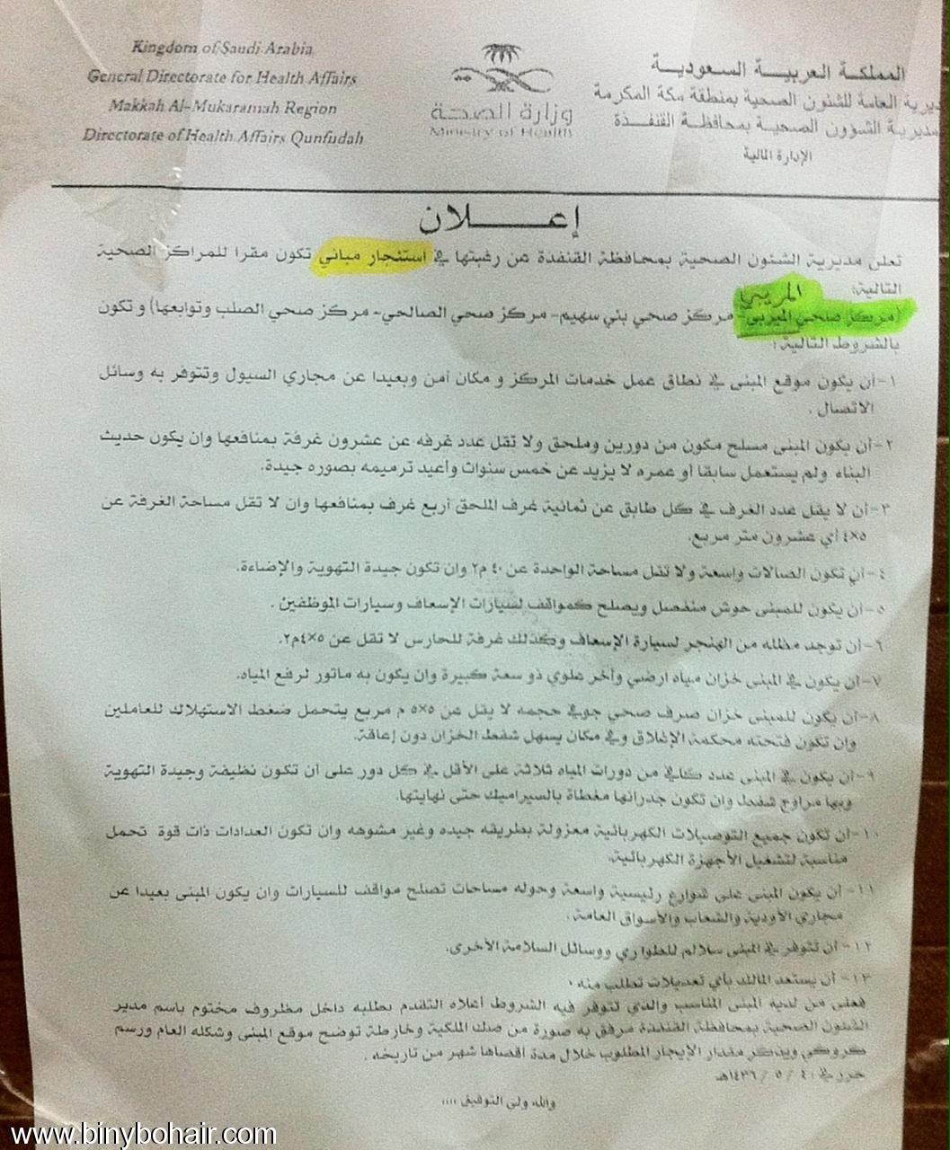 مديرية الشؤون الصحية بالقنفذه تعلن عن رغبتها في استجار مبنى يكون مقراً لمركز صحي المريبي اعلنت مديرية الشئون الصحيه بمحافظة القنفذه عن رغبها في استجار مبني يكون مقراً لمركز صحي المريبي وهذا ولله الحمد يعتبر من المشاريع الناجحه الذي يخدم المنطقه ويزيدها انتعاشاً وقد استبشر اهالي المنطقه كبيراً وصغيراً بهذا الاعلان وان شاء الله يكون تنفيذه وتشغيله قريباً علماً ان الاعلان يتضمن : - مركز صحي المريبي - مركز صحي بني سهيم - مركز صحي الصالحي - مركز صحي الصلب وتوابعها ![]() |