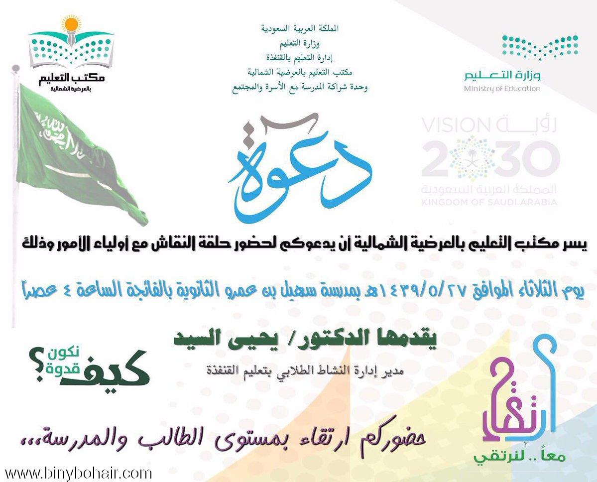 ![]() ![]() دعوة ... لحضور حلقة النقاش لأولياء امور الطلاب في مدرسة سهيل بن عمرو بالفائجة تحت اشراف مكتب التعليم بالعرضية الشمالية ويقدمها الدكتور /يحي السيّد وذلك عصر اليوم اثلاثاء1439/5/27 وحضوركم يرتقي بمستوى الطالب والمدرسة |