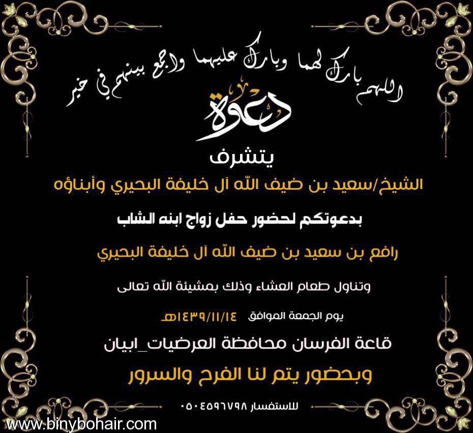 دعوة ..."عويضة بن احمد القرني" يدعوكم لحضور زواج ابنه " محسن "1439/4/4 بالقاعة الذهبية بجدة | علي بن قحمان القرني | أفراح وتهاني بني بحير بلقرن | 2 | 12-06-2017 05:08 AM |