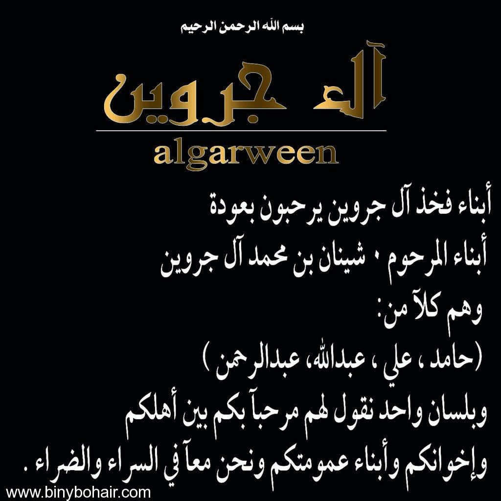 ![]() ![]() أبنا فخذ آل جروين يرحبون بعودة أبناء المرحوم شينان بن محمد ال جروين وهم كلاً من : ( حامد ، علي ، عبدالله ، عبدالرحمن ،) وبلسان واحد نقول لهم مرحباً بكم بين أهلكم واخوانكم وابناء عمومتكم ونحن معاً في السراء والضراء |