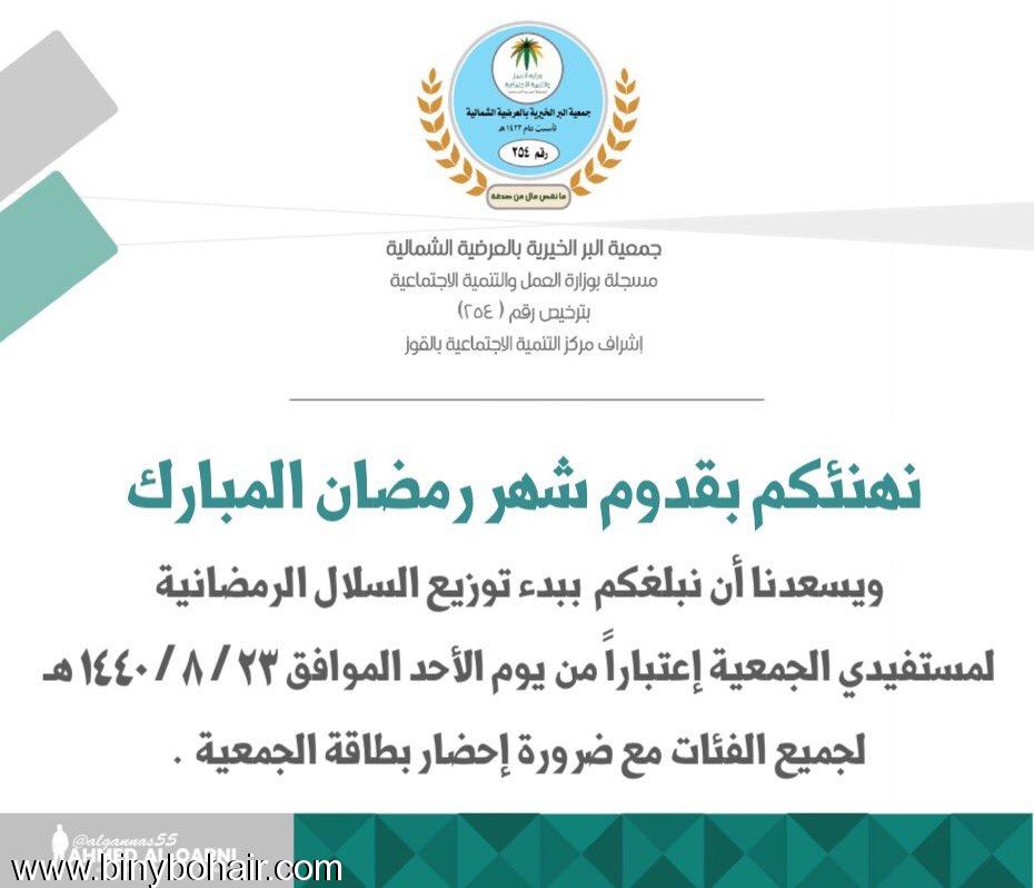 ![]() ![]() نهنئكم بقدوم شهر رمضان المبارك ويسعدنا أن نبلغكم ببدء توزيع السلال الرمضانية لمستفيدي الجمعية إعتباراً من يوم الأحد الموافق 23 / 8 / 1440 هـ ((( لجميع الفئات ))) 📌مع ضرورة إحضار بطاقة الجمعية . |