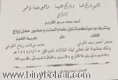دعوة…" احمد علي حامد آل مريّع" يتشرف بدعوتكم لحضور زواج ابنه" بركات" في 1444/5/4 بقصر الوسام | علي بن قحمان القرني | أفراح وتهاني بني بحير بلقرن | 1 | 11-14-2022 05:15 AM |