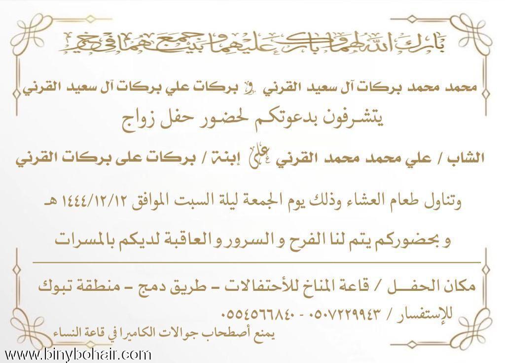 دعوة .." احمد سعيد علي القرني " يتشرف بدعوتكم لحضور زواج ابنه "محمد" في قاعة نسائم الشرق بالحرازات | علي بن قحمان القرني | أفراح وتهاني بني بحير بلقرن | 1 | 11-23-2022 09:45 PM |