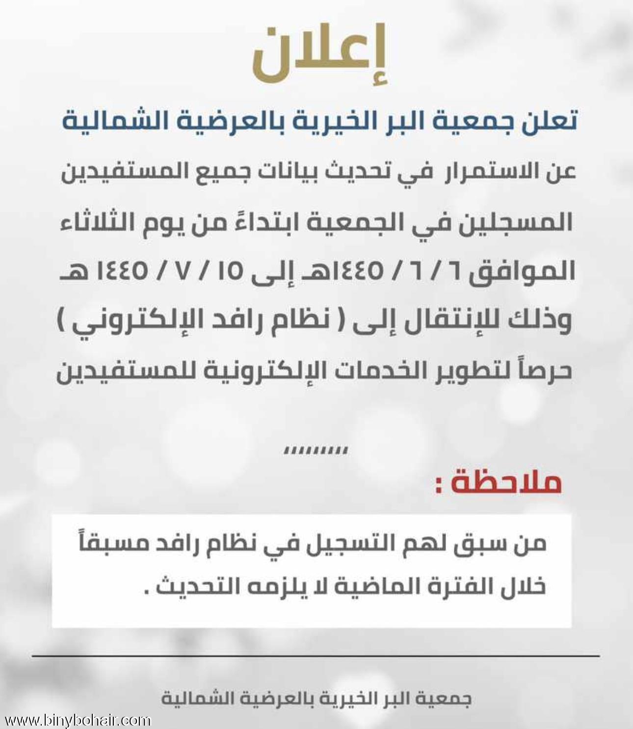 جمعية البر بالعرضية الشمالية على المستفيدين تحديث بياناتهم | علي بن قحمان القرني | جمعية البر بالعرضية الشمالية | 1 | 03-19-2022 07:25 AM |