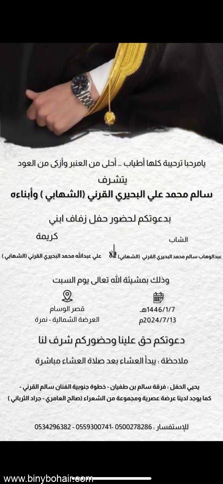 دعوة…" سريح محمد الشهابي القرني" يتشرف بدعوتكم لحضور زواج ابنه " علي " في قاعة تولين بسبت الجاره 1444/12/26 | علي بن قحمان القرني | أفراح وتهاني بني بحير بلقرن | 1 | 06-25-2023 06:29 AM |